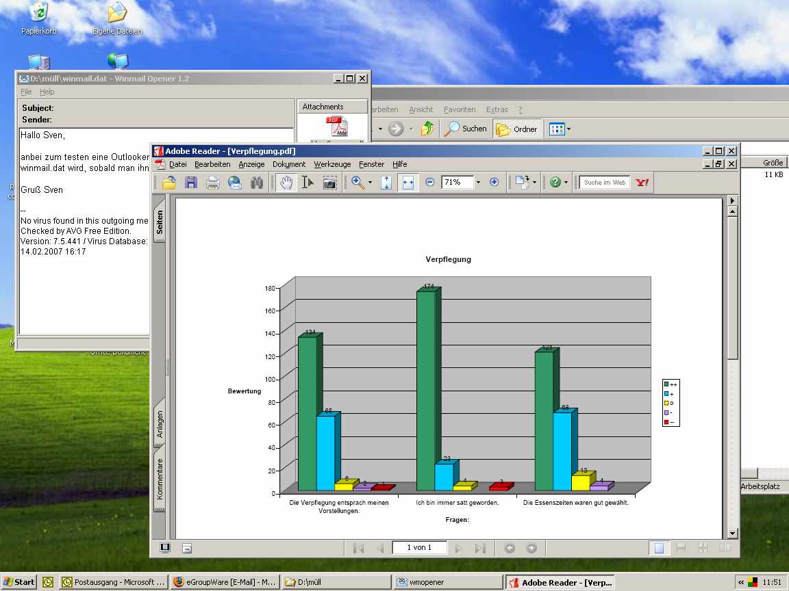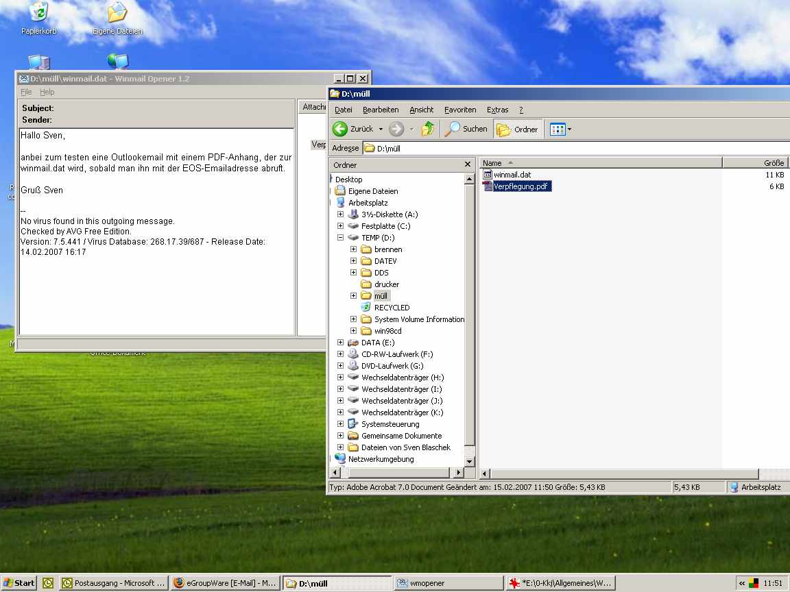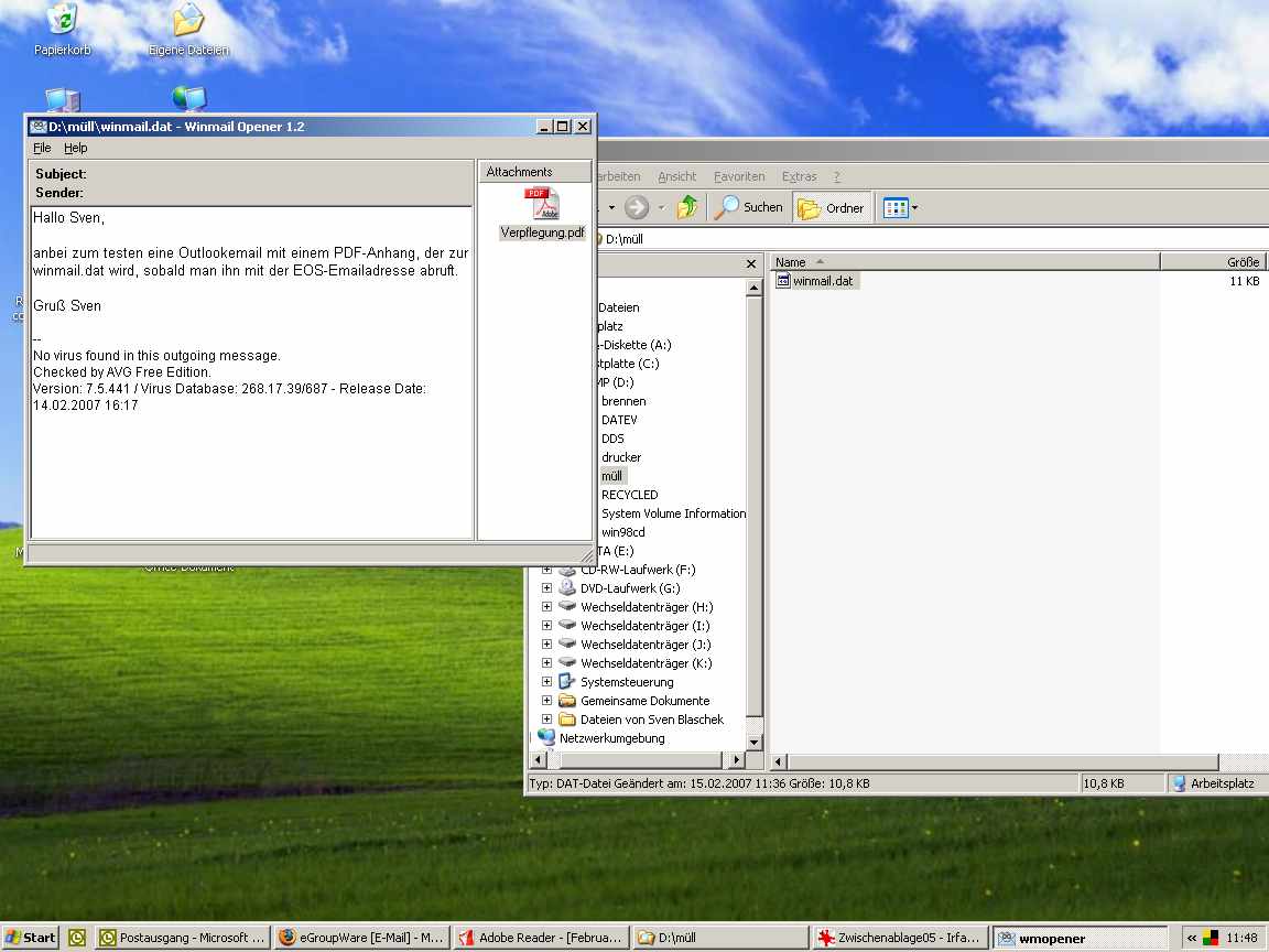 5. Das Programm Winmail_Opener öffnet automatisch die winmail.dat Datei, zeigt den Emailtext an und im rechnten Fensterbereich die angehängte Datei. Siehe Bild "opened"