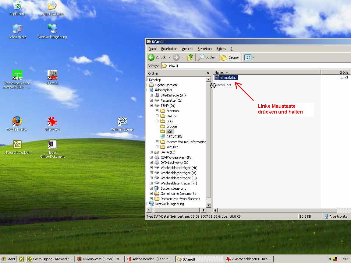 3. Über die "winmail.dat" Datei mit dem Mauszeiger fahren, linke Maustaste drücken und gedrückt halten. Siehe Bild "drag"