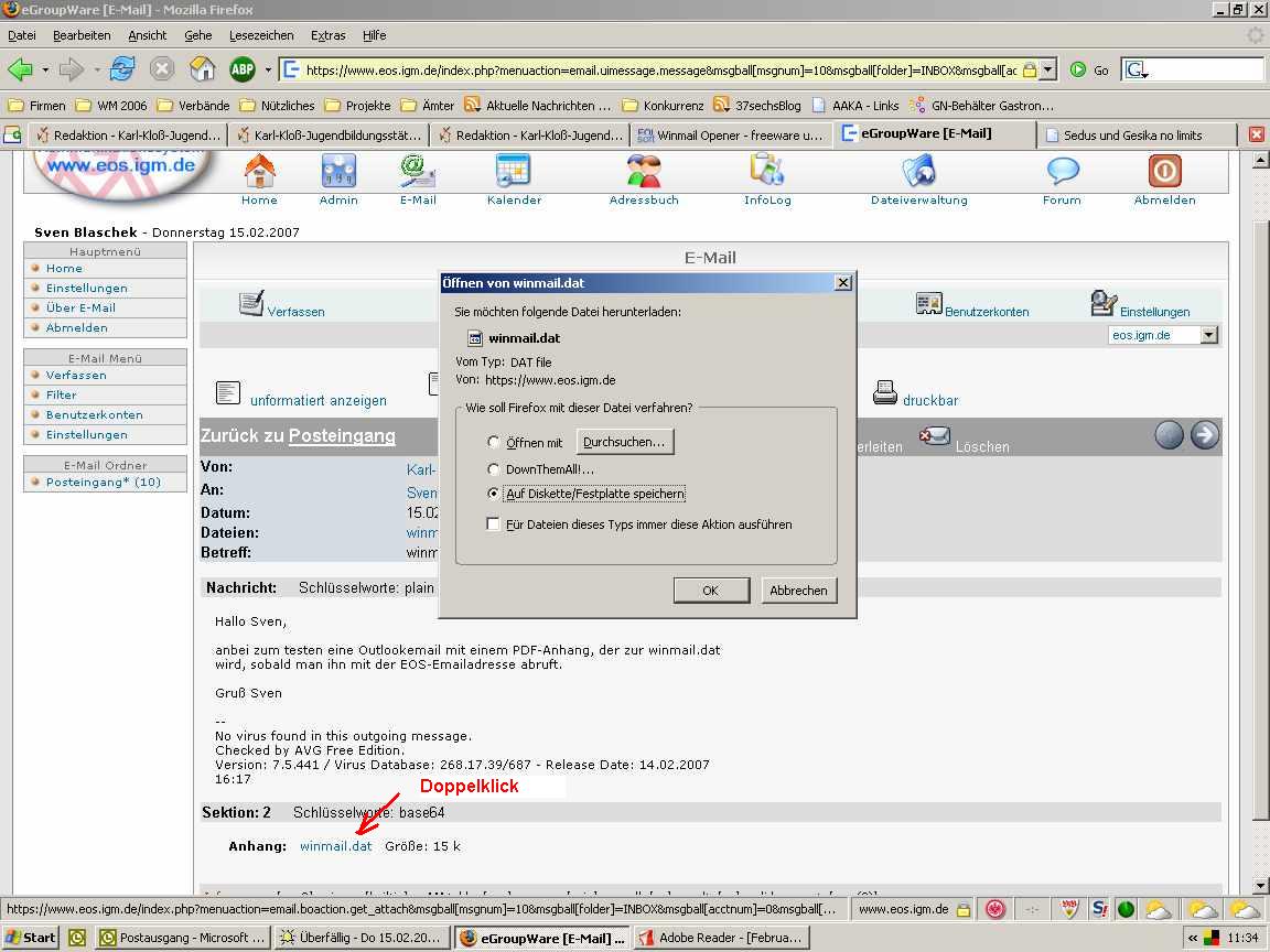 Wenn man die Datei mit einem Emailprogramm wie "Thunderbird" abruft kann man je nach Programm die "winmail.dat"-Datei direkt aus dem Programm über "Winmail_Opener" ziehen. Bei einem Abruf über den Browser wie bei der gezeigten EOS-Adresse, muß man die "winmail.dat"-Datei zuerst speichern um Sie umwandeln zu können.