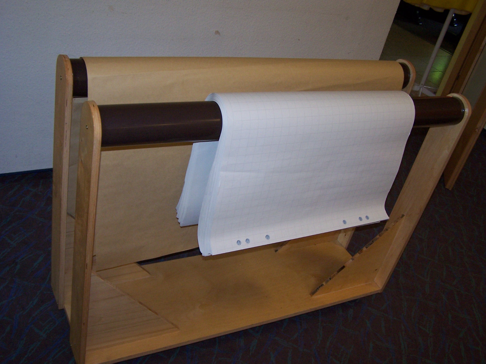 sind Sie diese Woche fertig geworden. Im Vergleich zu den alten Papierhaltern sind die neuen stabiler und haben zwei Ablageflächen, so das Flip-Chart und Wandzeitungspapier gelagert werden kann.