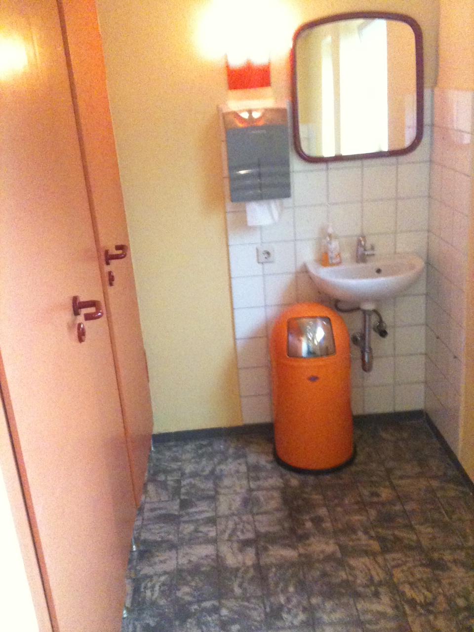 Außerdem haben wir in den Sanitärräumen die Mülleimer ausgetauscht, da die alten nicht mehr nutzbar waren und teilweise auseinander fielen. Jetzt haben wir passend zur Logofarbe orangene Mülleimer. Auch hiervon gibts anbei ein Bild.