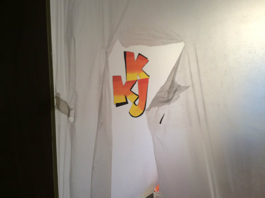Etwas anderes tut sich noch, nämlich eines unserer Zimmer verändert sich im Moment, da einige Fliesen schon von der Wand zu fallen drohten haben wir uns kurz entschlossen gleich den Fliesenspiegel neu zu machen und das Zimmer neu zu streichen. Wie ihr seht mit Logo an der Wand, dank unserer beiden Kolleginnen die sich hier künstlerisch betätigt haben.