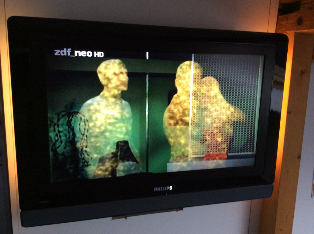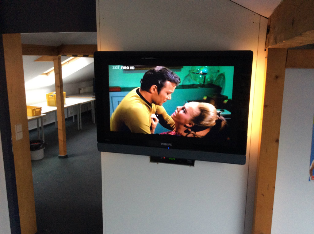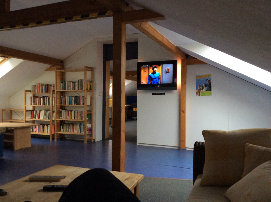 Dank der tatkräftigen Unterstützung unserer Bundesfreiwilligen, hängt direkt neben dem Seminarraumeingang, ein Fernseher an der Wand mit fest eingebautem, Satreceiver darunter. Von den Sofas kann man nun bequem die