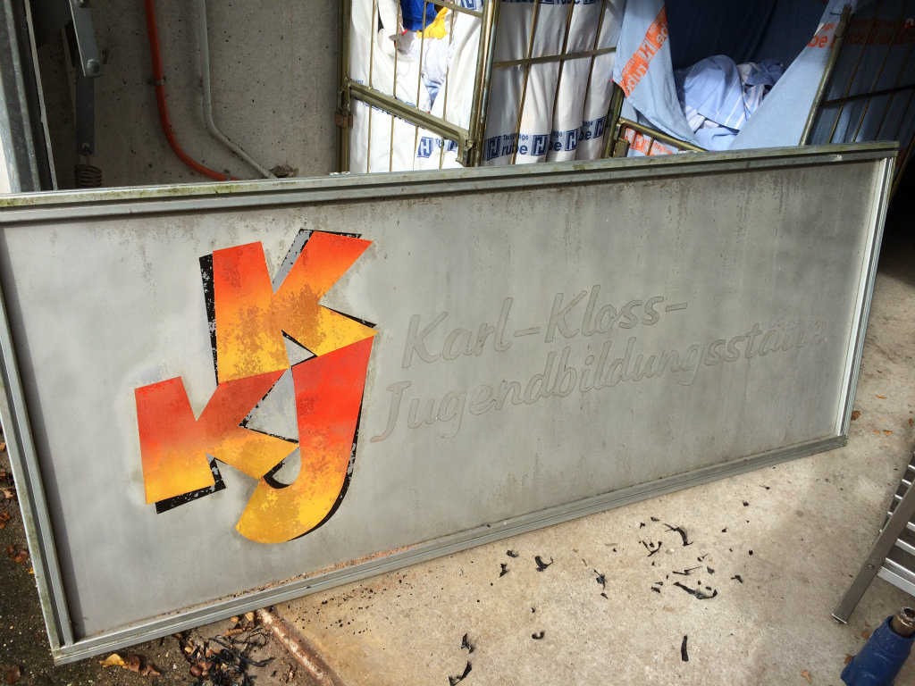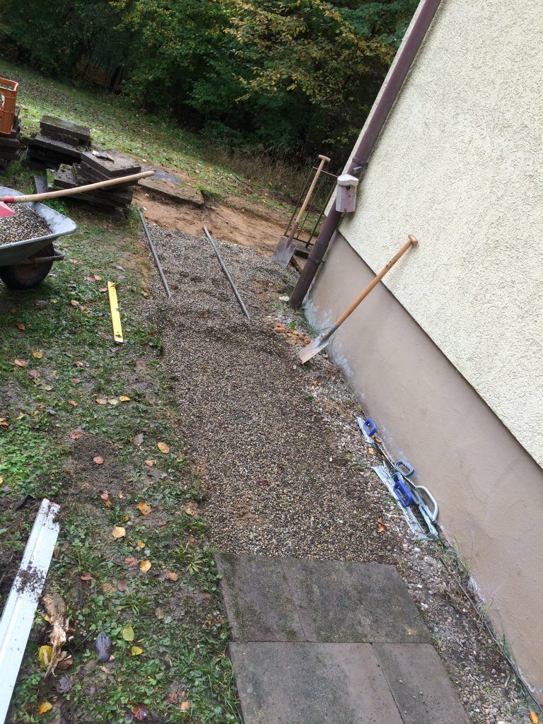 Das Ziel: Die Erneuerung unseres Schildes über dem Eingang, und die Platten am Wegg vor dem Haus links anheben und neu verlegen.